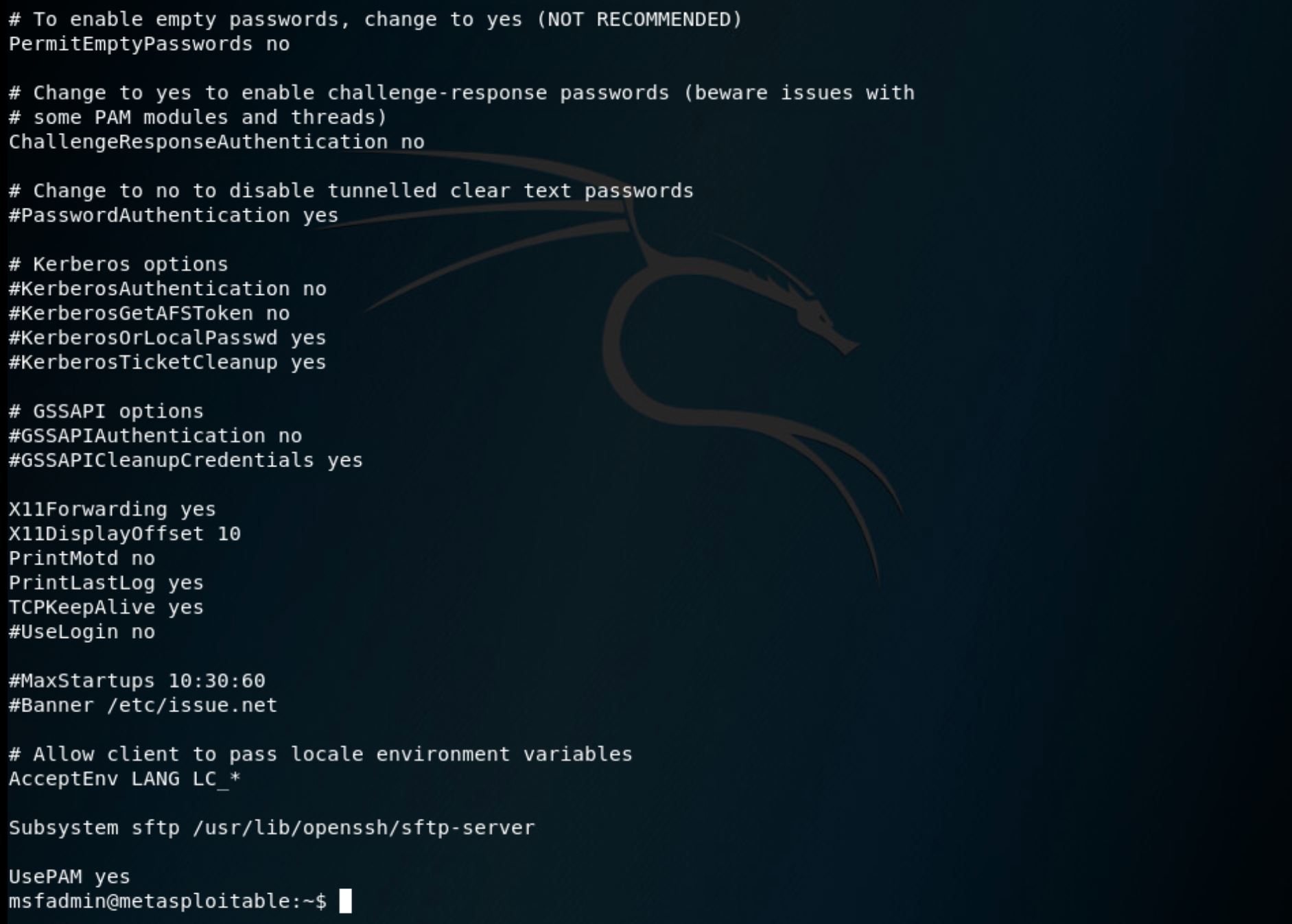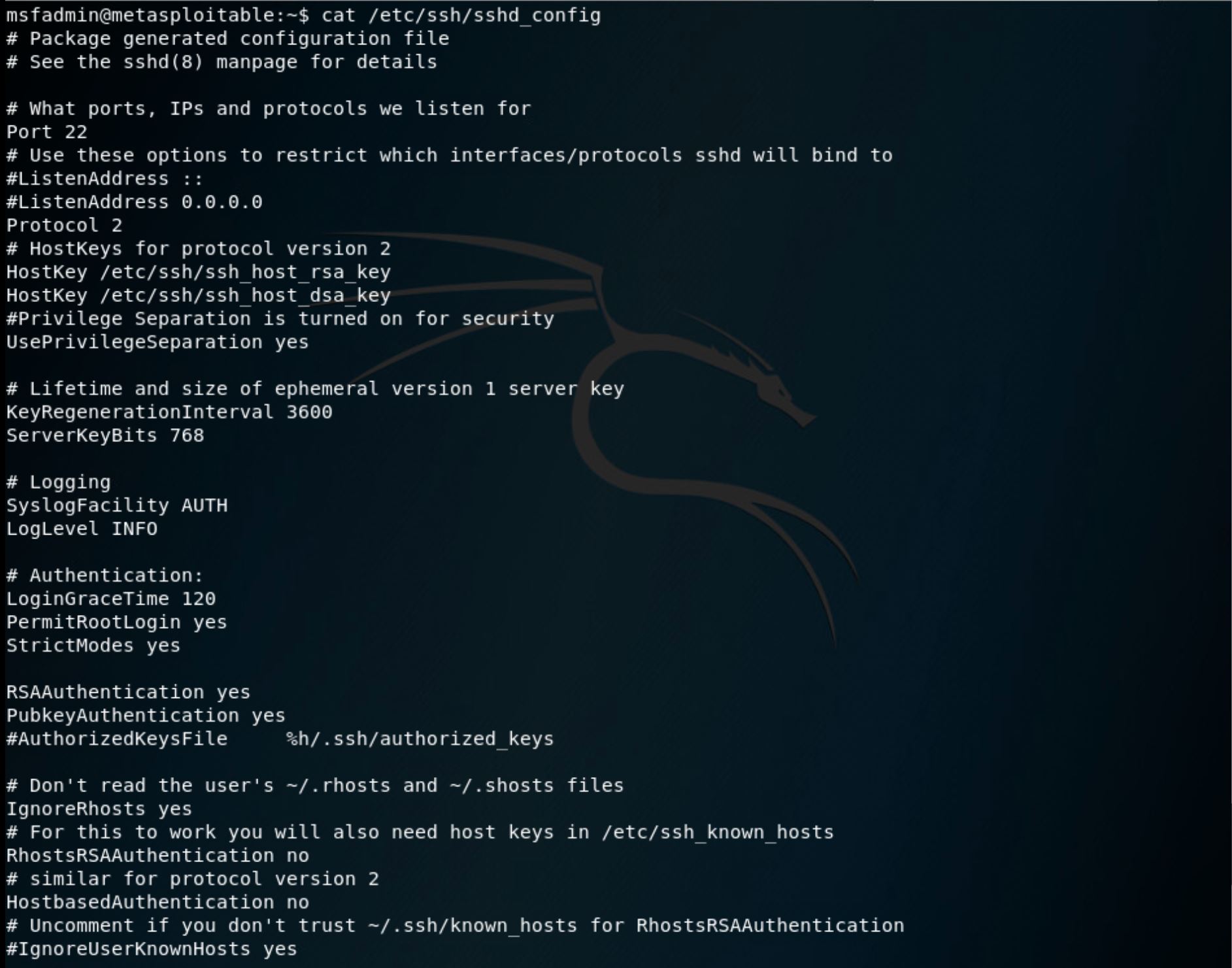 SSHThe screenshot below shows the default configuration for the target's SSH service, as given in the file /etc/ssh/sshd_config (many services place their configuration folder in the /etc directory).