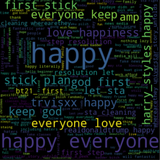 That's it! You now have a quick way to view what people say about specific subjects. Your final task is to run your program on 3 different INTERESTING search terms (using the BIG tweet file), and save their word clouds. You'll turn these in and explain to me why they are interesting. The cloud at the very top of this page is for "new year".