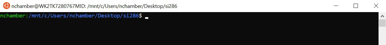 Directory setup. Before we begin, let's setup your Ubuntu WSL terminal so it starts up in an SI286 folder. Open Ubuntu on your laptop if it is not already open. Copy/paste the entire following text into your terminal and hit enter.
