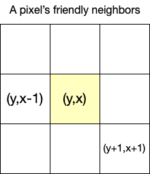 This works most of the time, except when the pixel is on an edge of the image. For example, if the x coordinate is 149 then this pixel is on the right edge of the image (150 pixels wide), and there is no pixel to the right of it. You will need some if statements to check for these "edge cases" and NOT try to access pixels outside of the correct range. Accessing outside an edge will crash your program because that location doesn't exist!