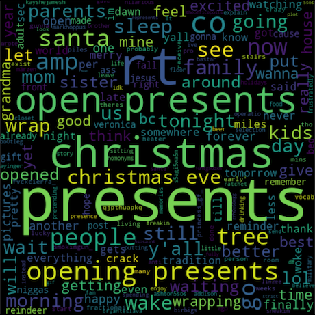 That's it! You now have a quick way to view what people say about specific subjects. Your final task is to run your program on 3 different INTERESTING search terms (using the BIG tweet file), and save their word clouds. You'll turn these in and explain to me why they are interesting. The cloud at the very top of this page is for "new year".