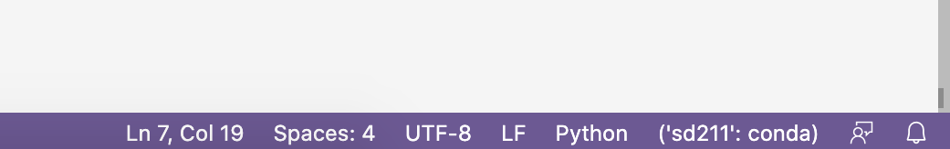 We're ready to go. Open VSCode and we'll tell it to use your new environment. Open VSCode. Look to the bottom right of its screen. It says "Python", and next to it should be a specific version. Click that version, and a list of available environments are shown. One of them should be your new conda sd211! Choose it, and you'll see ('sd211': conda) like this: