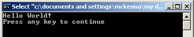 Now, minimize the VS.NET window. Double-click on My Computer and go to your lab folder. Inside you will see a folder called HelloWorld. Open it. There is a file named HelloWorld.cpp – it is your source code file. Note the size of the file (~ 1 kb). Now, double-click on the Debug folder. The file titled HelloWorld contains the executable file—that is, your program’s object code combined with all of the other necessary object code to run your program. Note the size (~450 kb)!!