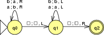 This machine swaps all the a's and b's in a string, using the 2-way nature of the tape to move the tape head back to the beginning of the string. This isn't interesting in terms of a language decided or semi-decided, but shows how the 1-way tape simulates the 2-way tape, which is the important point here.![]()